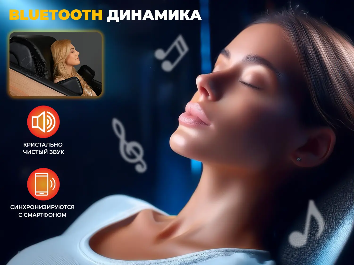 Кресло оснащено встроенными динамиками с поддержкой беспроводного подключения. Вы сможете наслаждаться четким и чистым звуком любимых треков или аудиокниг, не отрываясь от сеанса массажа.