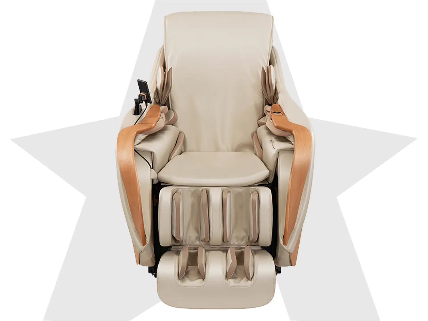 На левом подлокотнике расположена панель быстрого управления, с помощью которой можно мгновенно поставить массаж на паузу, возобновить сеанс, активировать режим невесомости или полностью выключить кресло. Дополнительно панель оснащена USB-портом для удобной зарядки мобильных устройств.