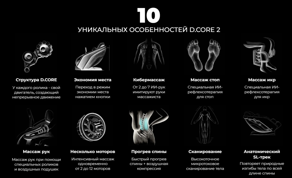 Кресло D.CORE 2 оснащено 13 автоматическими программами массажа, предназначенными для определённого времени суток или для тех частей тела, которые требуют особого внимания.
