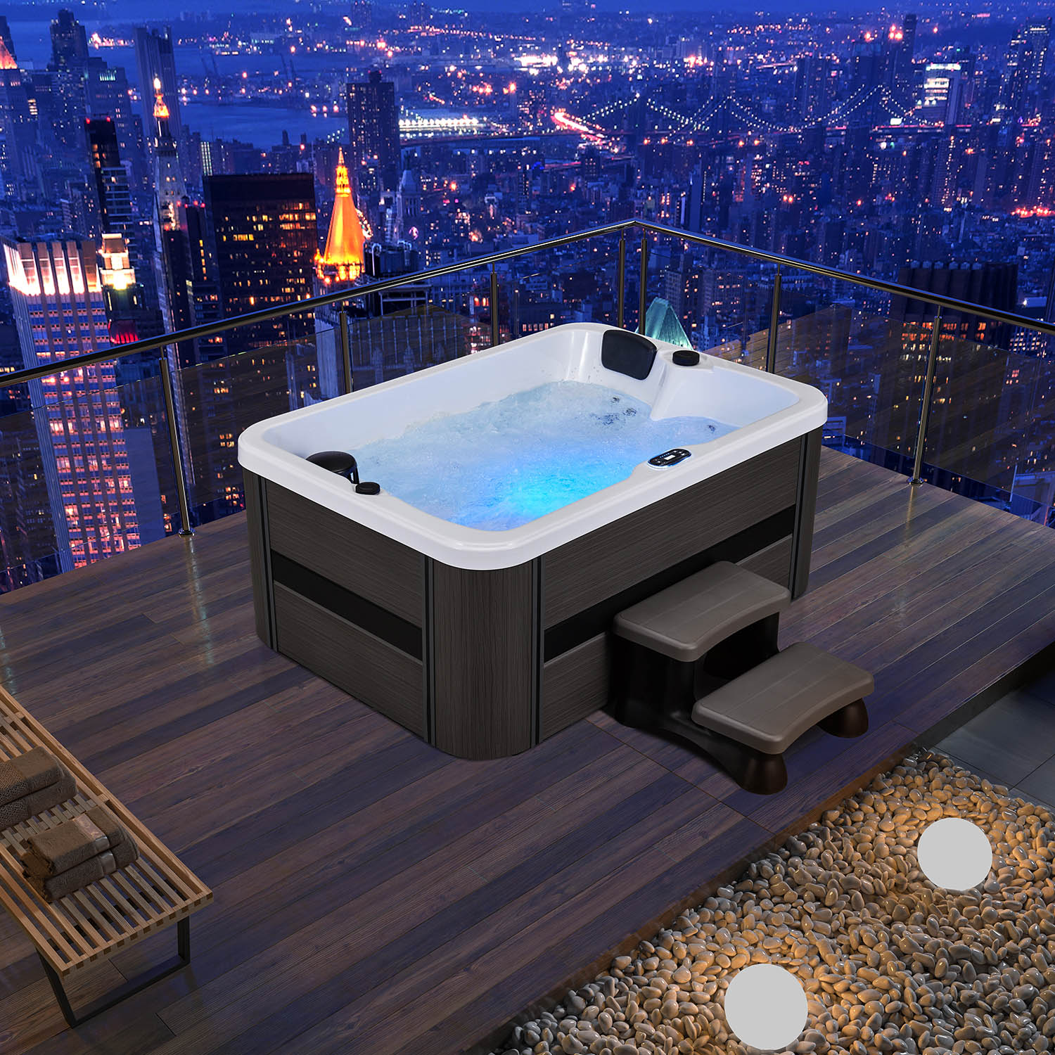 Важным и необходимым аспектом работы бассейна является система фильтрации в виде картриджного фильтра и озонатора. Эта система очистит воду на все 100%, не используя при этом различных химикатов. Немаловажную роль для стильного дизайна играет LED-подсветка, создаёт дополнительное освещение, поэтому пользоваться бассейном можно и в темное время суток. Струи воздуха и воды улучшают качество массажа, способствуют хорошему кровообращению в организме, благодаря форсункам. Регулируйте направление, мощность и давление воды или воздуха на форсунках с помощью электронной системы управления Balboa BP6013G2 + TP600 (США).
